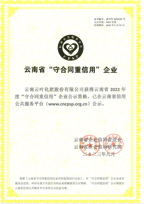 云南省“守合同重信用”企业 2023-09-12 暂无评论 admin 资质荣誉 分享到: 上一篇: 2022年度工会重点工作目标责任评定-特优单位 下一篇: 云叶被评定为“2023云南制造业企业100强” 相关文章 中国中微量元素及肥料产学研创新联盟镁肥专委会 2024全国绿色肥料影响力品牌示范单位——第十五届全国肥料“三新”研讨会牌匾 仓储中心QC小组 “无机一班”为二0二四年云南省化工行业质量信得过班组 “电工组”为二〇二四年云南省化工行业质量信得过班组 云叶被评定为“2023云南高新技术企业100强”第45名 云叶被评定为“2023云南民营企业100强”第63名 云叶被评定为“2023云南制造业企业100强” 2022年度工会重点工作目标责任评定-特优单位 云南省非公企业创新能力10强(2022)第8位